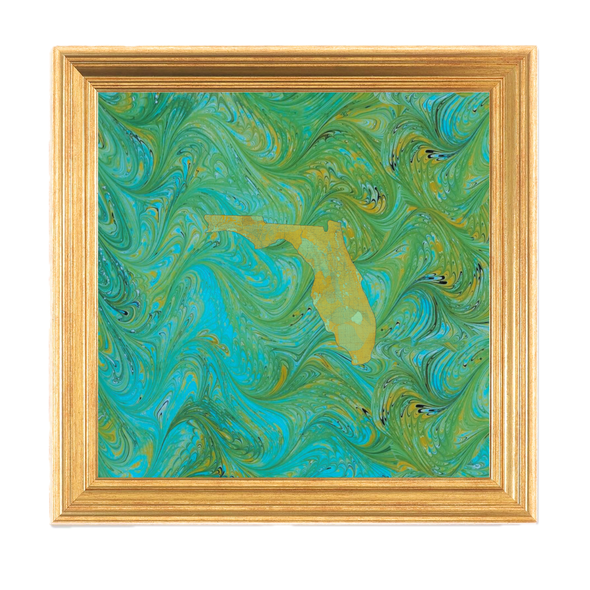 Bring the vibrant spirit of Florida to your walls with this striking 8x8 giclée. This piece pairs a vintage of Florida with the rich movement of real marbled paper. The swirling turquoise, green, and golden tones dance across the background, giving the piece a fluid, coastal energy—like waves, palms, and sun captured on paper.